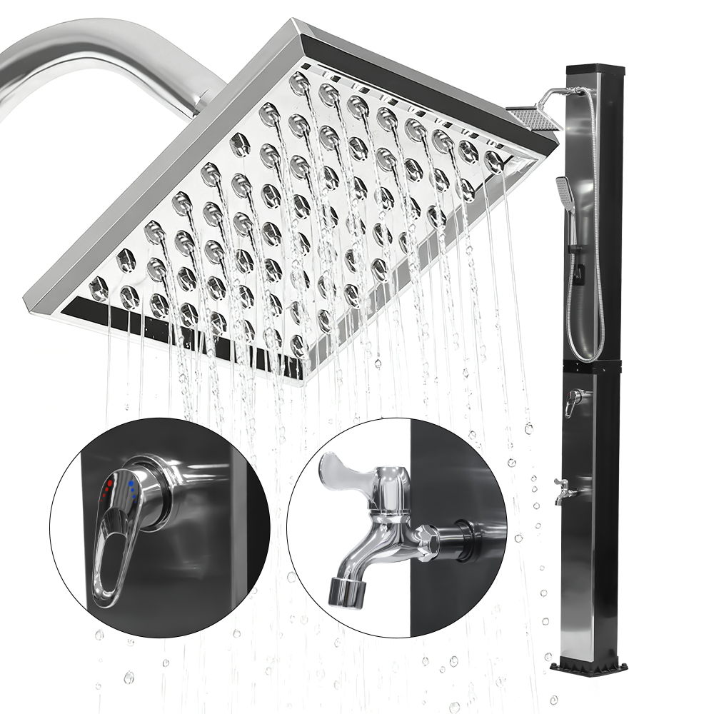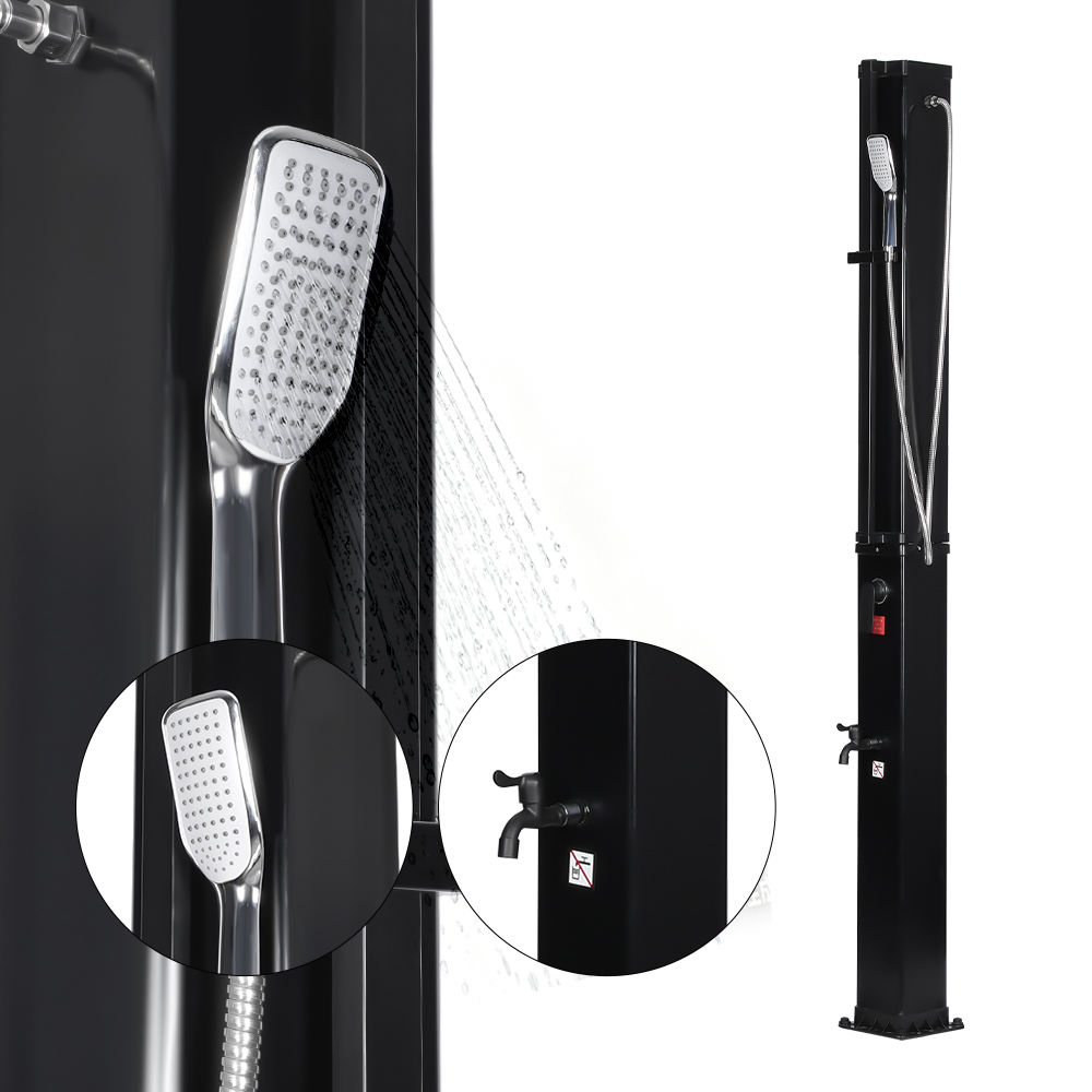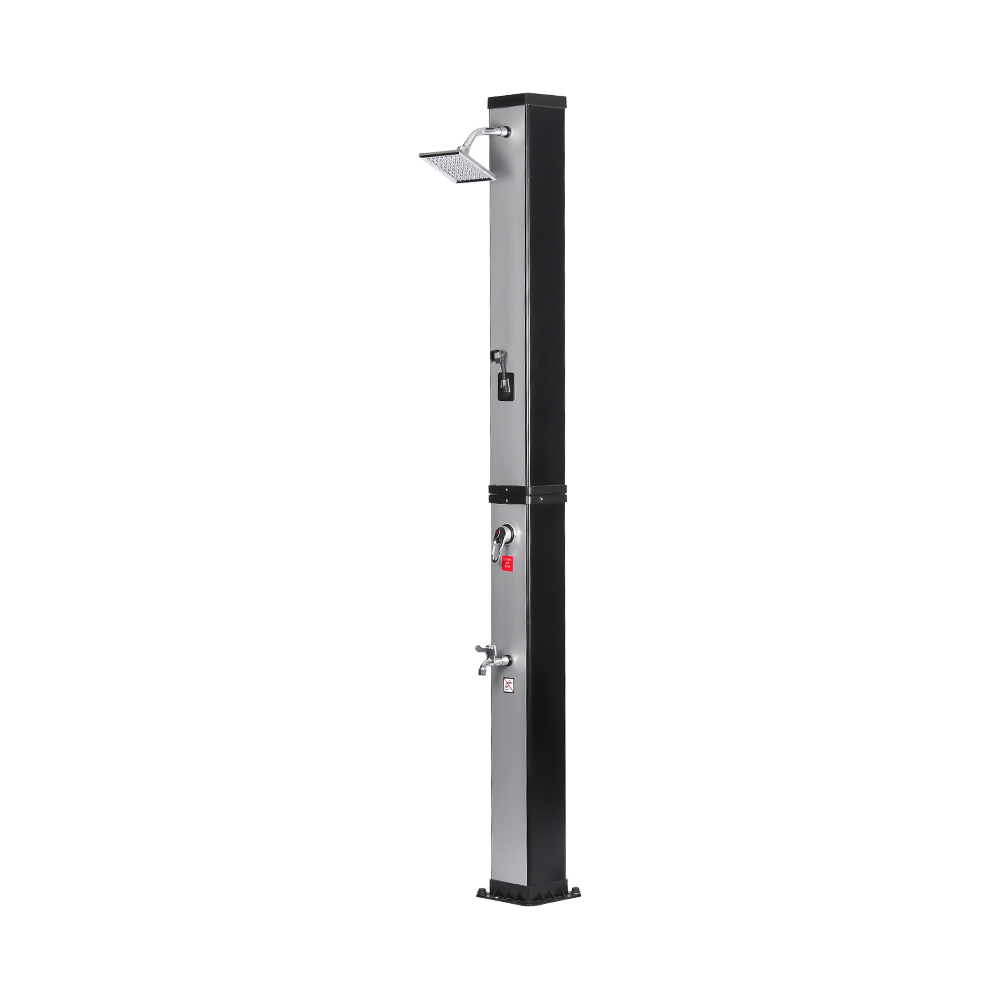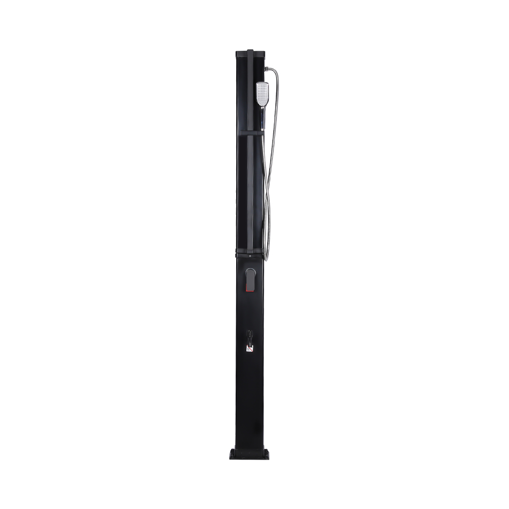Denne LY35L07 multifunktionelle solbruser med stor kapacitet bruger kun sollys til at varme vand op til 60°C, hvilket giver en energibesparende og miljøvenlig måde at nyde udendørs badning på. Det er nemt at fylde det – tilslut blot en standard haveslange til indløbet, og bruserøret bliver hurtigt klar til brug. En indbygget metalhylde tilbyder et praktisk sted til opbevaring af showergel og andre væsentlige ting, mens drænhuller i bunden sikrer, at vandet flyder effektivt væk og holder området tørt og ryddeligt. Designet med alsidighed i tankerne, denne solbruser er perfekt til forskellige omgivelser, hvad enten det er på stranden, ved poolen, i et sommerhus, hotel eller bungalow. Dens fleksible struktur gør det muligt at tilpasse sig forskellige miljøer.