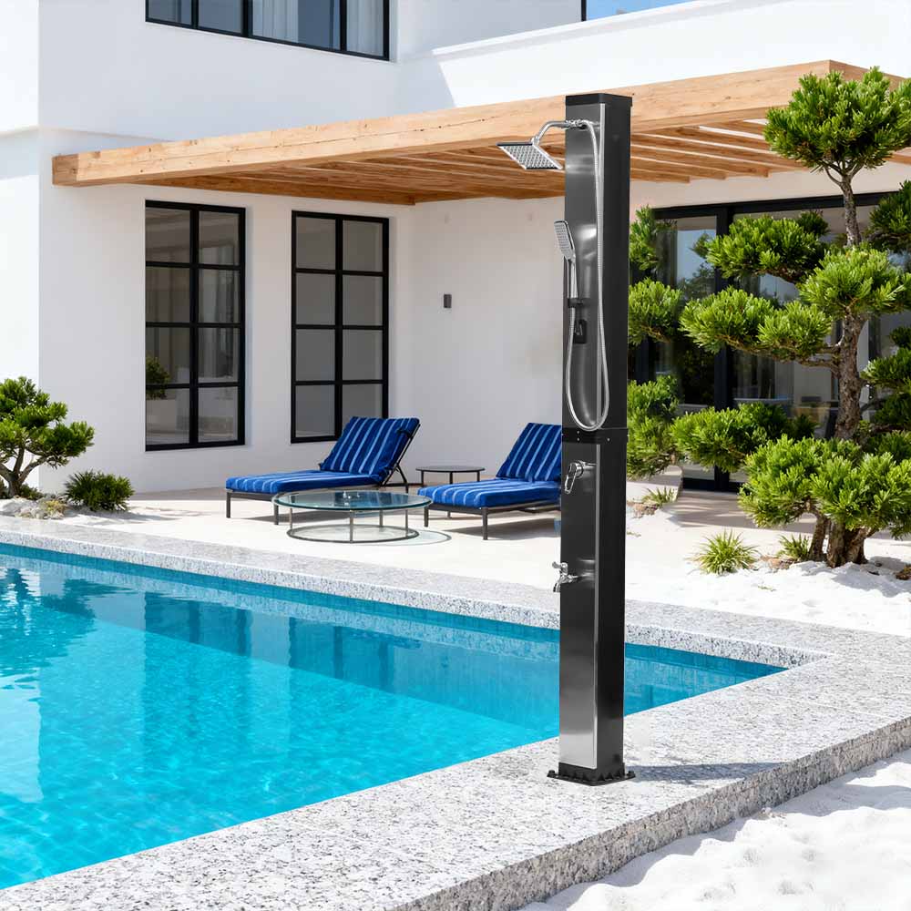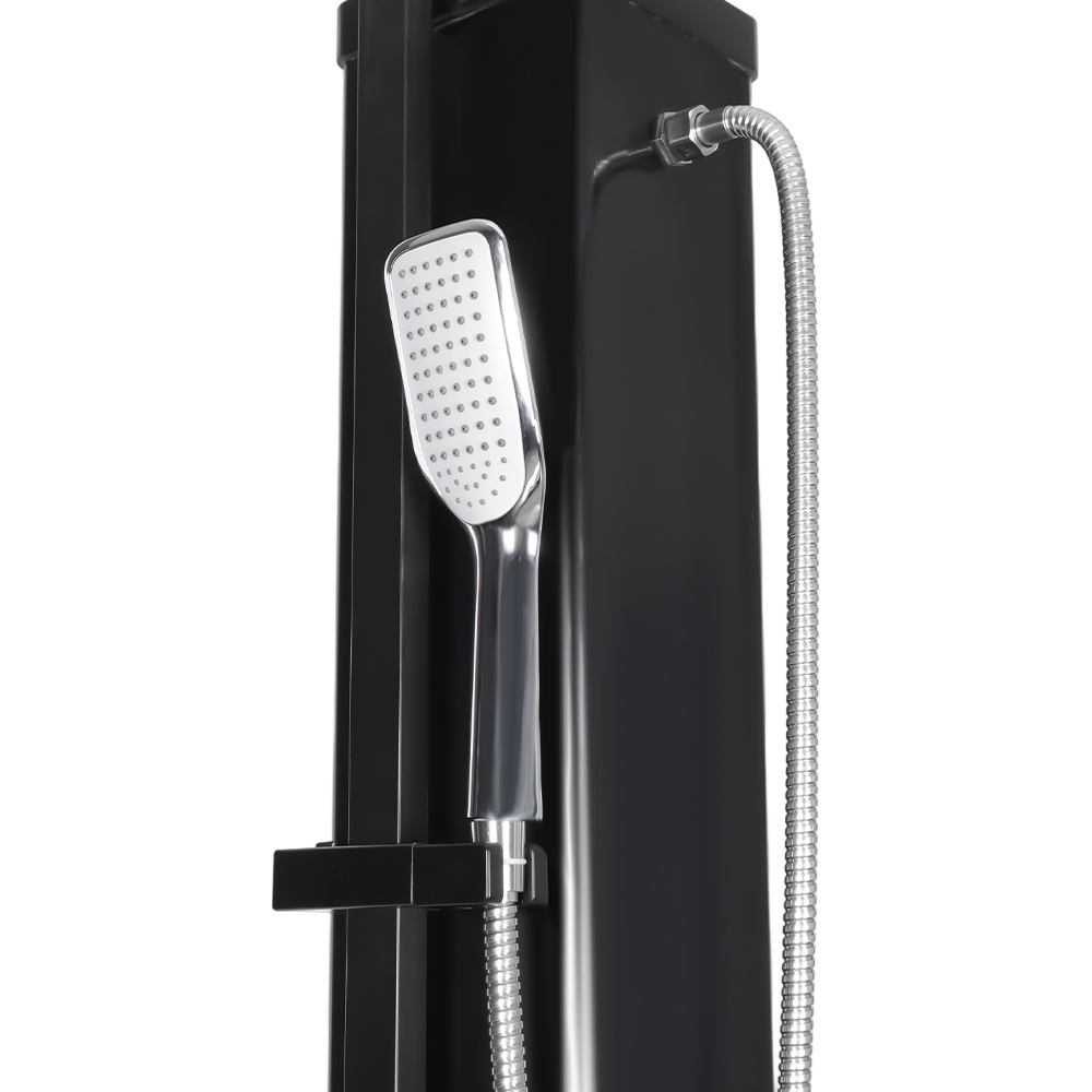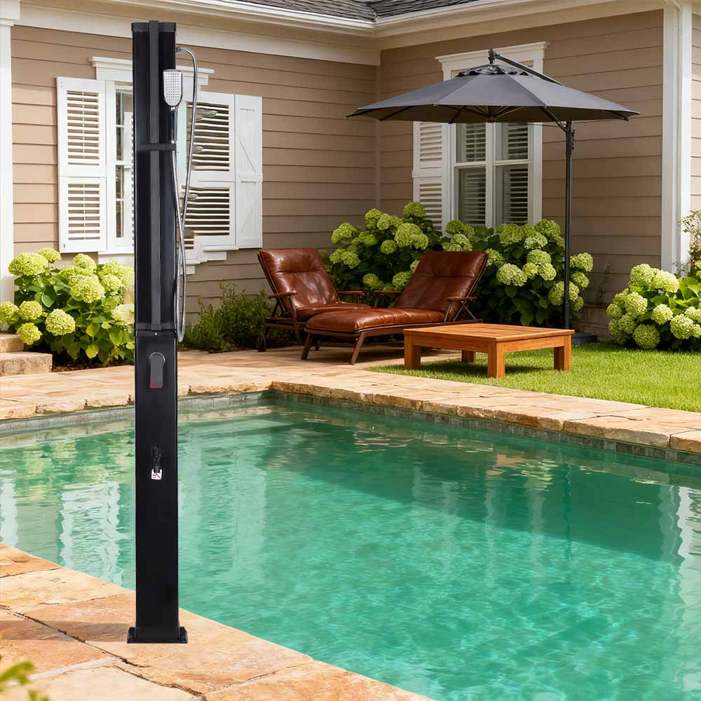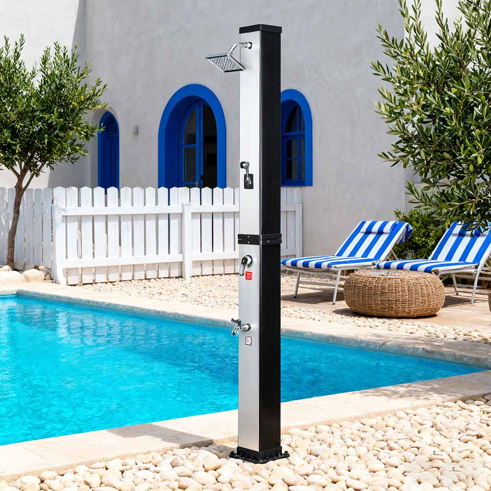 Denne LY35L07 multifunktionelle solbruser med stor kapacitet bruger kun sollys til at varme vand op til 60°C, hvilket giver en energibesparende og miljøvenlig måde at nyde udendørs badning på. Det er nemt at fylde det – tilslut blot en standard haveslange til indløbet, og bruserøret bliver hurtigt klar til brug. En indbygget metalhylde tilbyder et praktisk sted til opbevaring af showergel og andre væsentlige ting, mens drænhuller i bunden sikrer, at vandet flyder effektivt væk og holder området tørt og ryddeligt. Designet med alsidighed i tankerne, denne solbruser er perfekt til forskellige omgivelser, hvad enten det er på stranden, ved poolen, i et sommerhus, hotel eller bungalow. Dens fleksible struktur gør det muligt at tilpasse sig forskellige miljøer.