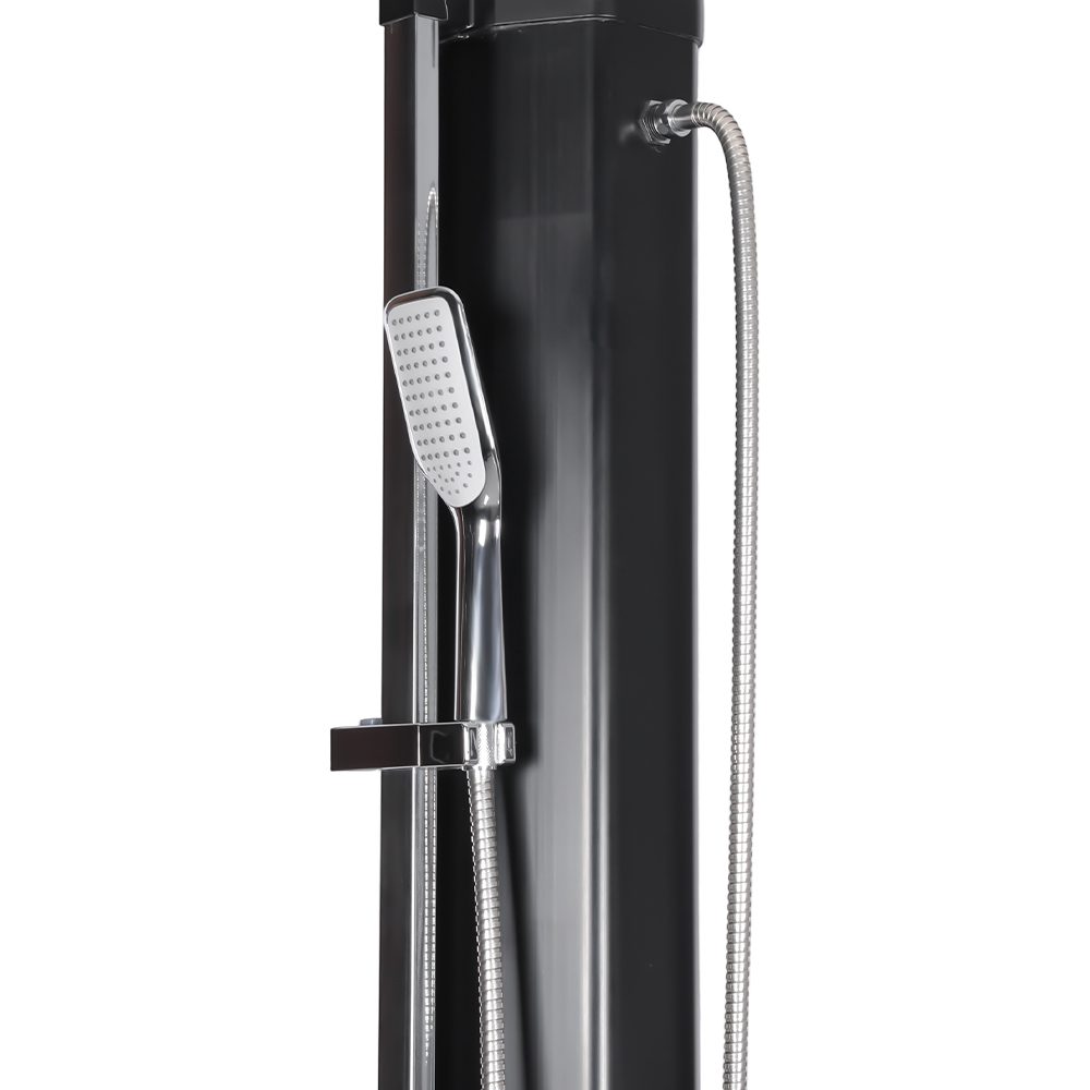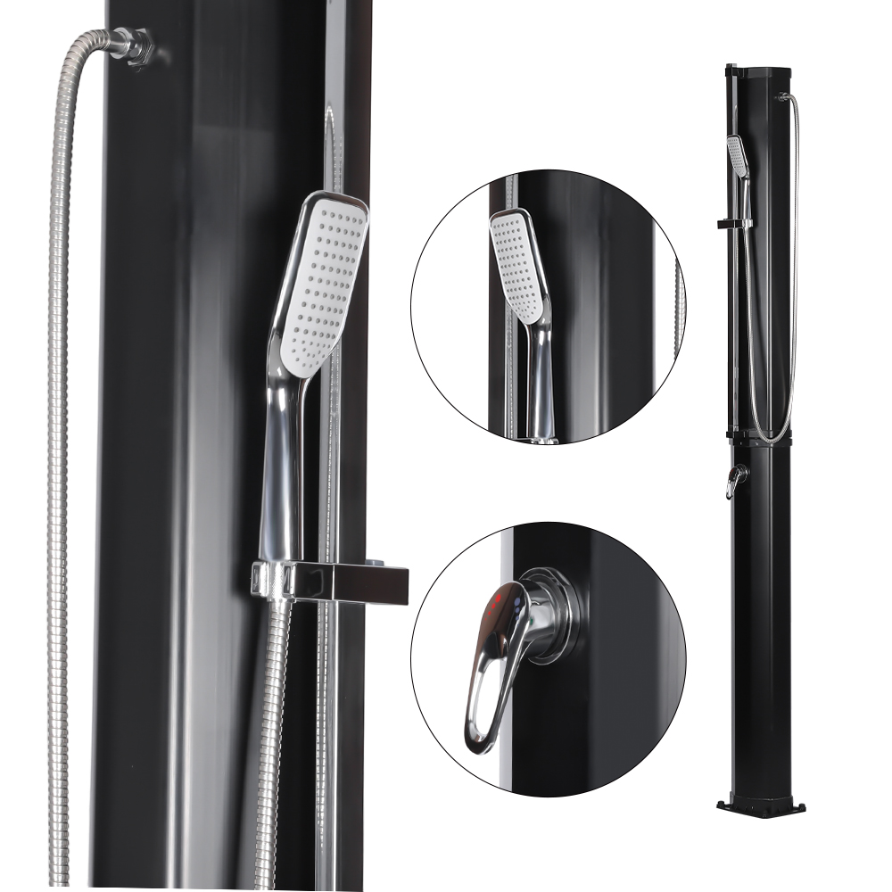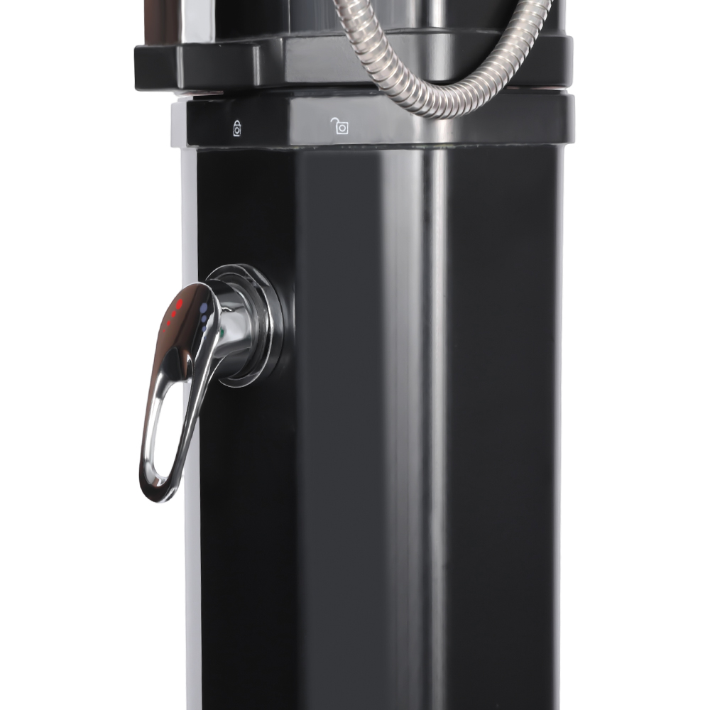 Denne LY35L08-HB stabile og effektive havesolbruser med stor kapacitet fungerer effektivt ved hjælp af sollys. Dens store 35-liters bruserør opvarmer vand til cirka 60°C i tilstrækkeligt sollys. Genopfyldning er enkel, kræver ingen elektricitet og kan nemt udføres ved at tilslutte til en standard haveslange. Dens store regnbruser giver en behagelig køleoplevelse, og dens integrerede kugleled gør det muligt at dreje op til 180° i forskellige vinkler. Installationen er også meget praktisk. Den overordnede struktur er lavet af holdbart, UV-bestandigt plastik, der effektivt modstår længere udendørs eksponering. Brusehovedet skilles hurtigt ad for nem transport mellem steder eller opbevaring i lavsæsonen. En robust metalbund sikrer stabilitet og sikkerhed, når den er installeret, så du kan nyde en behagelig udendørs bruser i din have, ved poolen eller på campingpladsen.