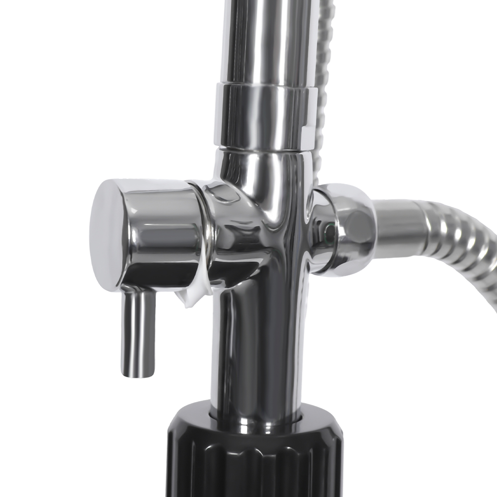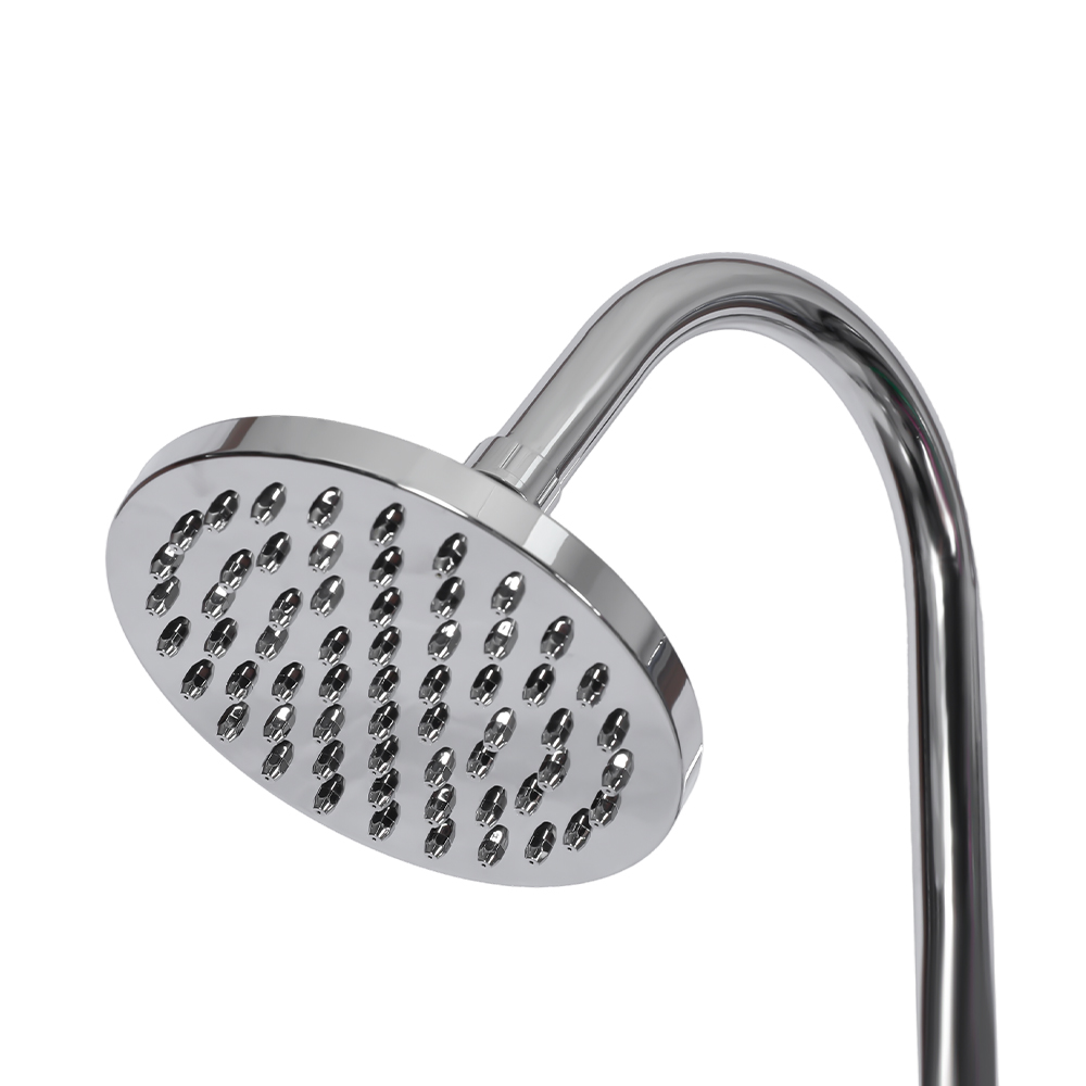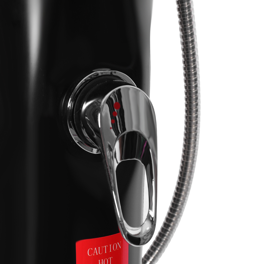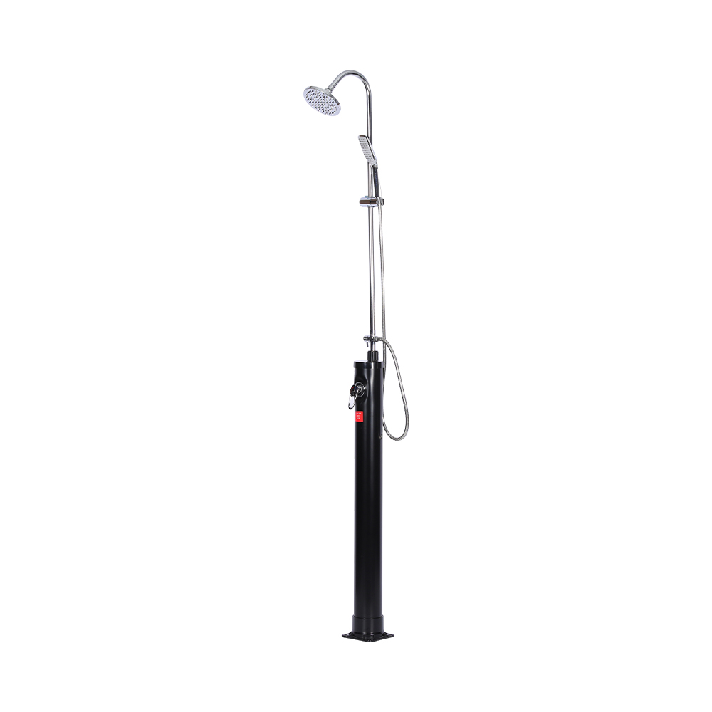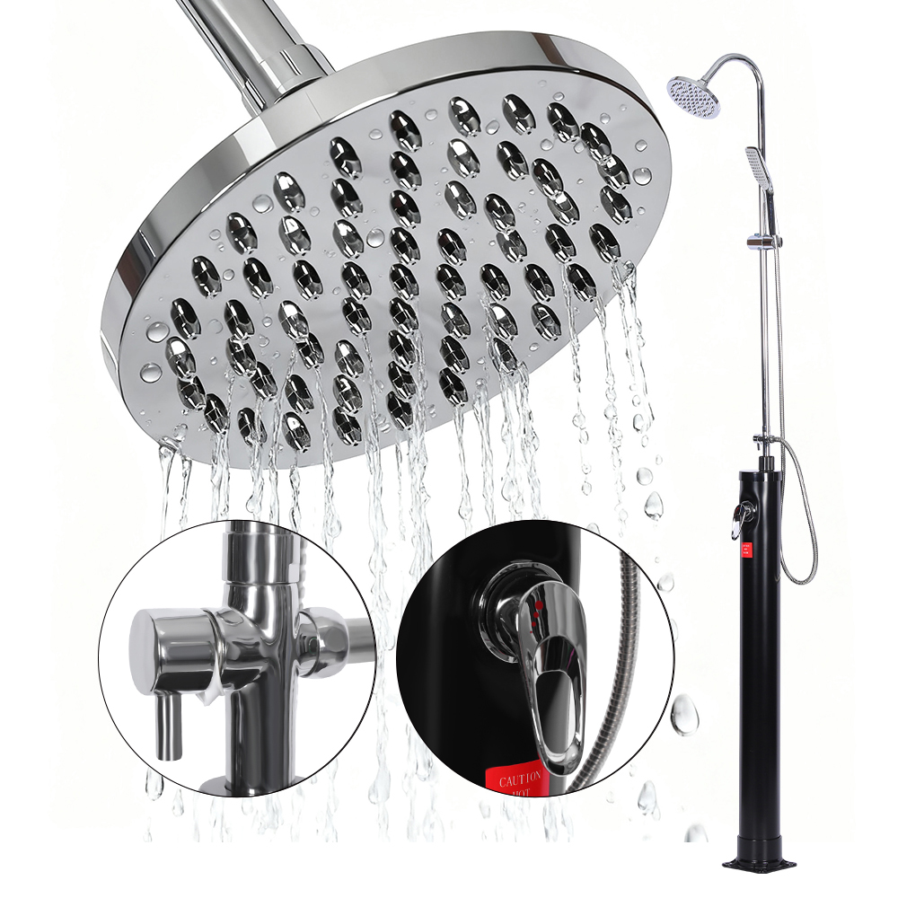 LY08L03 8L udendørs havepool solsøjlebruser har en etgrebsblander, der præcist regulerer vandtemperaturen ved at blande varmt vand fra bruserøret med koldt vand fra en haveslange. Den er udstyret med en haveslangetilslutning for bekvem påfyldning og en aftapningsprop, der tillader fuldstændig vanddræning for sikker vinteropbevaring. Bruserens enkelte dele er bygget på et solidt rustfrit stålunderlag for stabilitet og er sikkert fastgjort med skruer, og det skal forankres til jorden for sikker brug. Betjeningsvejledning er inkluderet og tilgængelig på flere sprog.